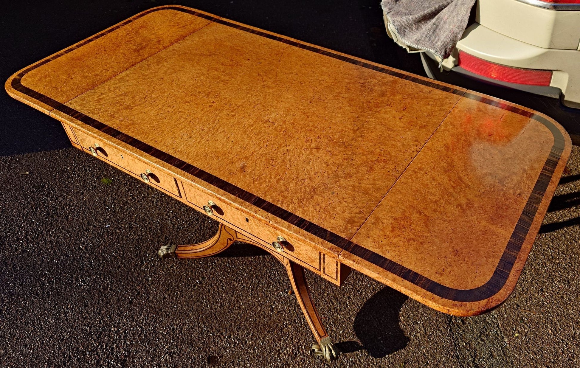 A very fine early 19th century sofa table, this table is made from two very expensive timbers, with coromandal cross banding and a huge swathe of amboyna on top, there can be few better ways to confer absolute poshness to any room setting. This table is free standing with false drawers to the reverse which means that it is a very useful piece being able to be used behind sofa, as a writing table or as a side table against a wall. The proportions are perfect the colour is wonderful and the timber is to die for. A truly fantastic table which must have been made for a very grand house indeed.