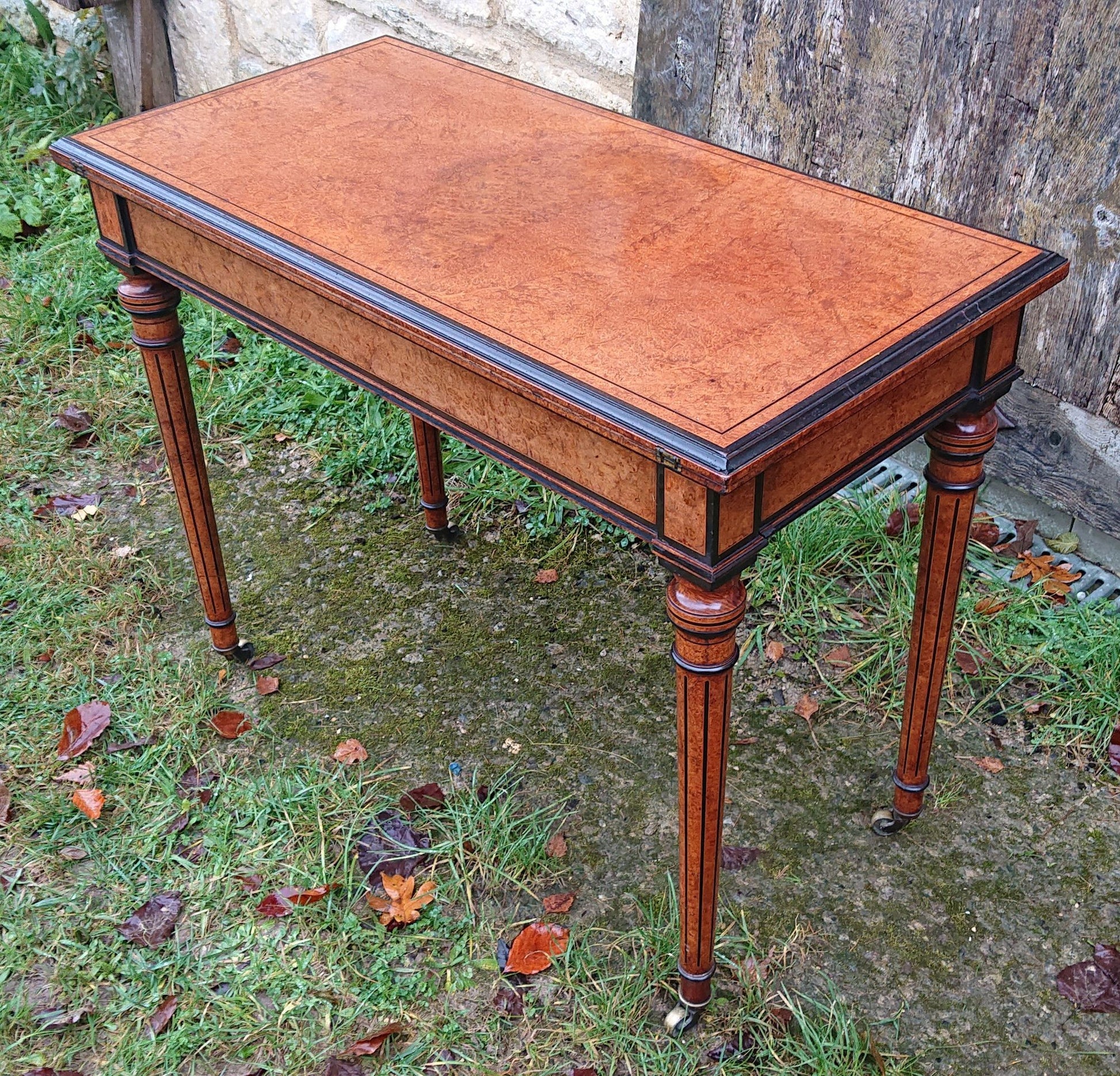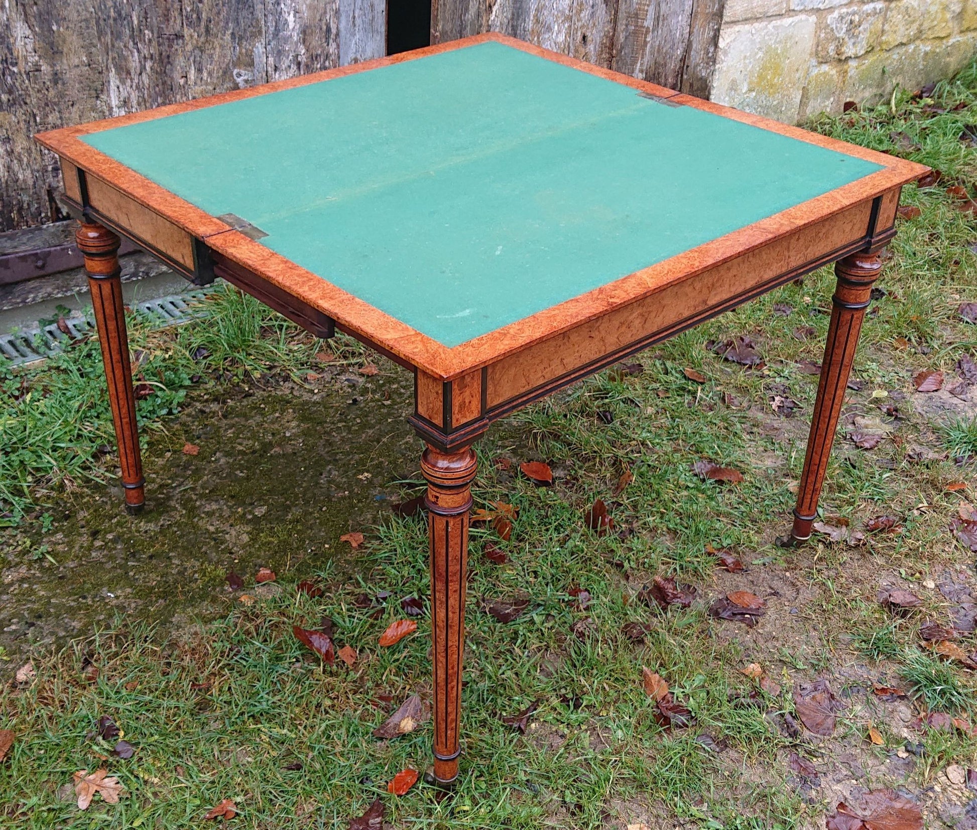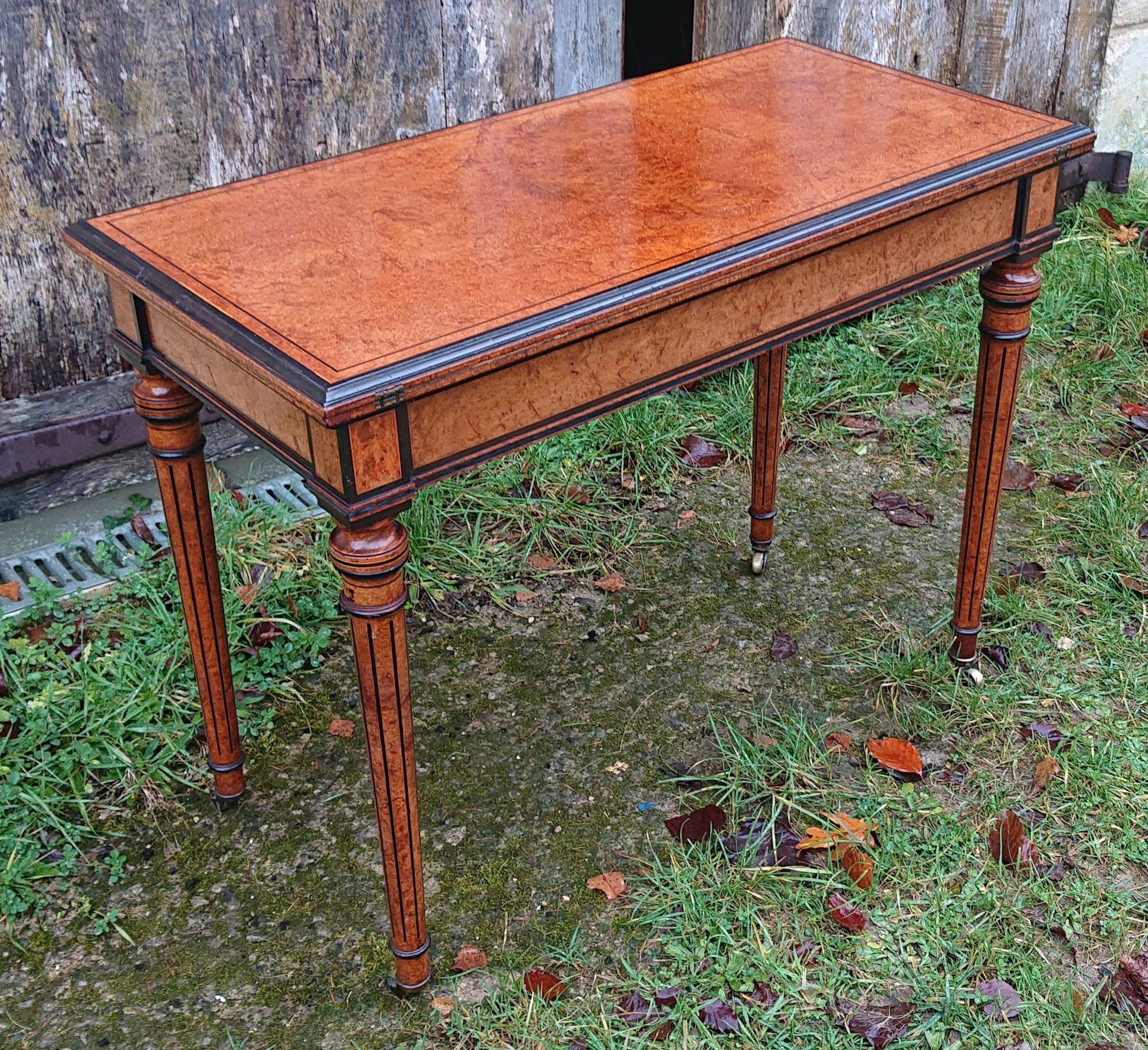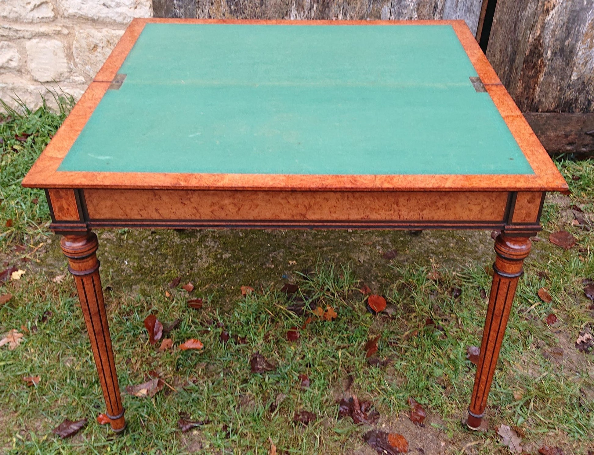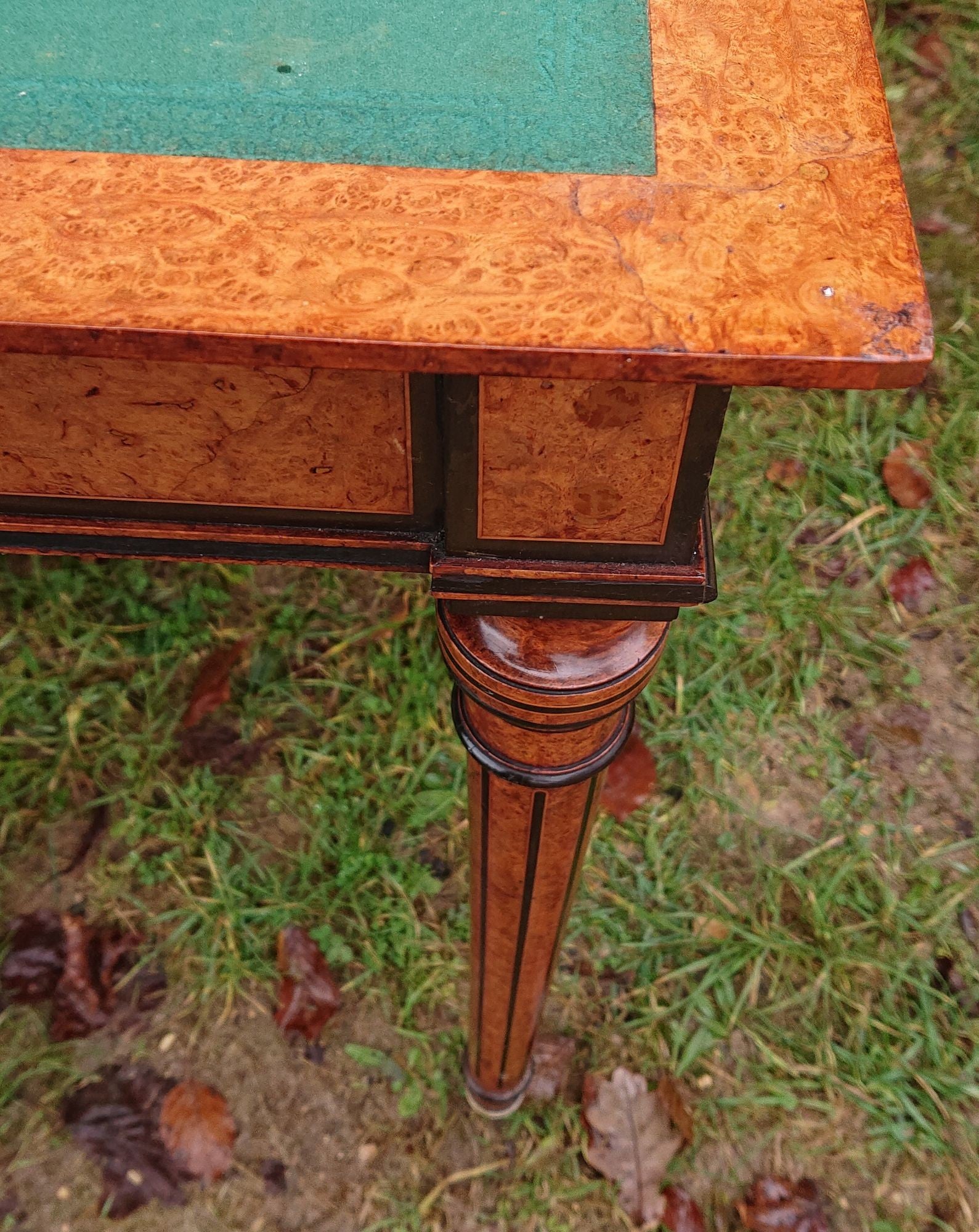 Very fine exhibition quality card table made from amboyna with mahogany sliding mechanism and drawer lining. The fluting is actually ebony inlay and there is very fine stringing throughout. The hinges and their screws fit really precisely and all the screw heads line up (see photos).