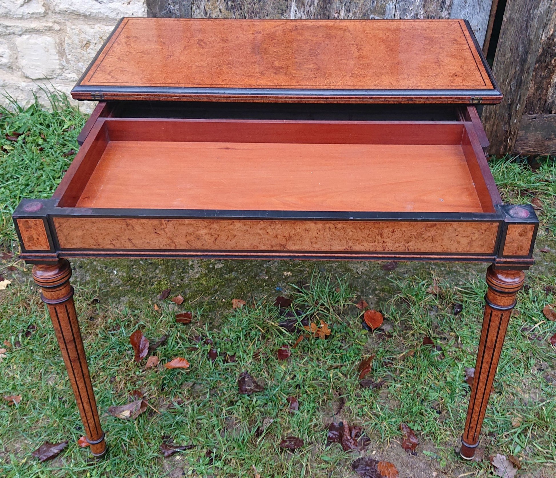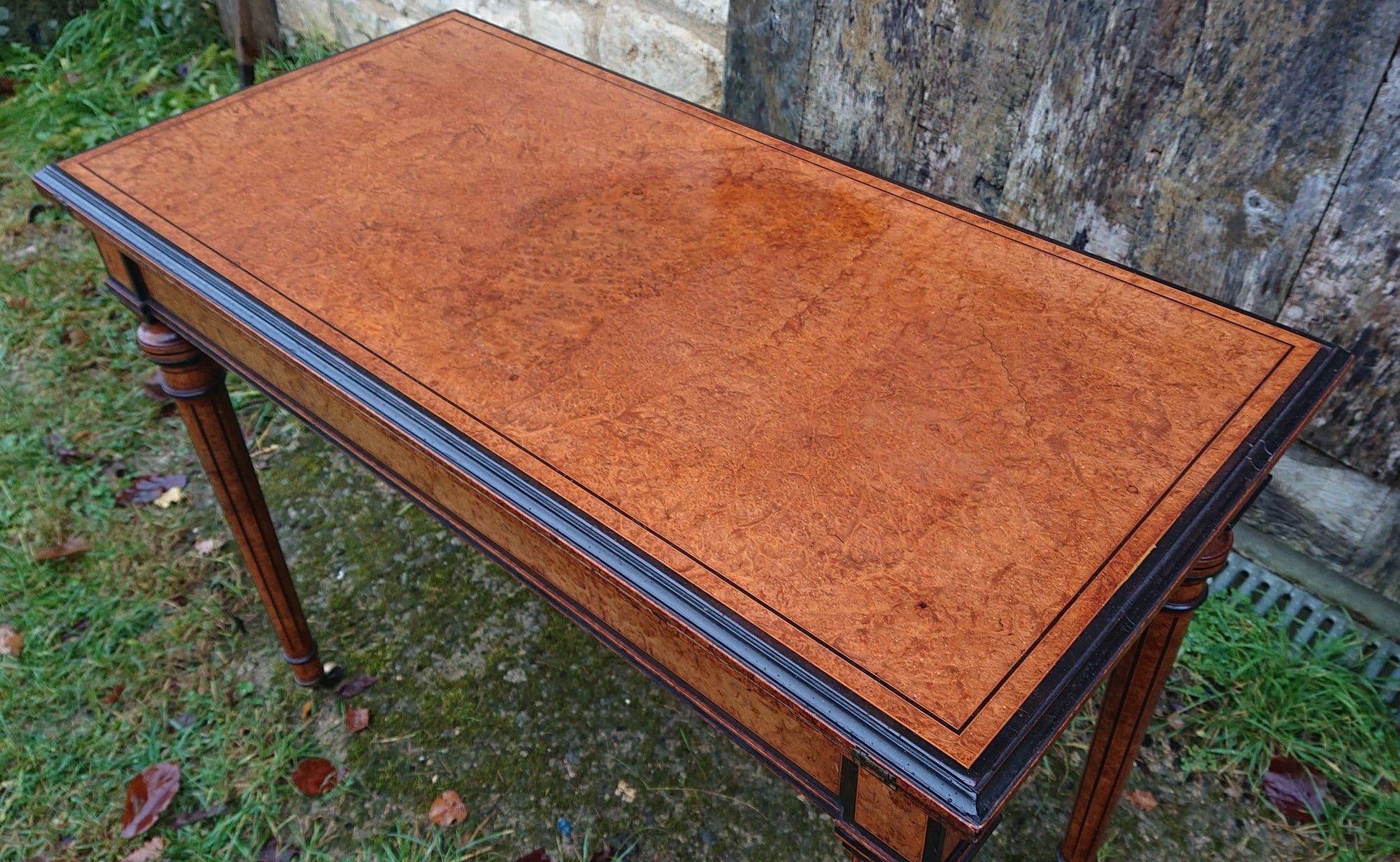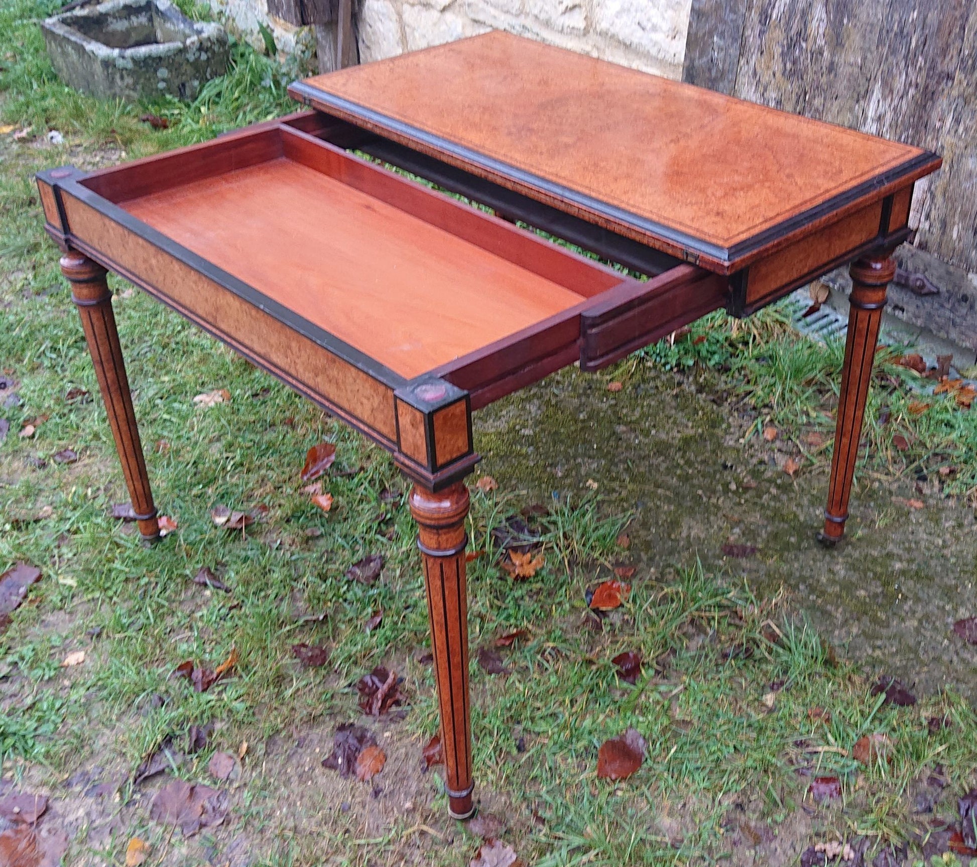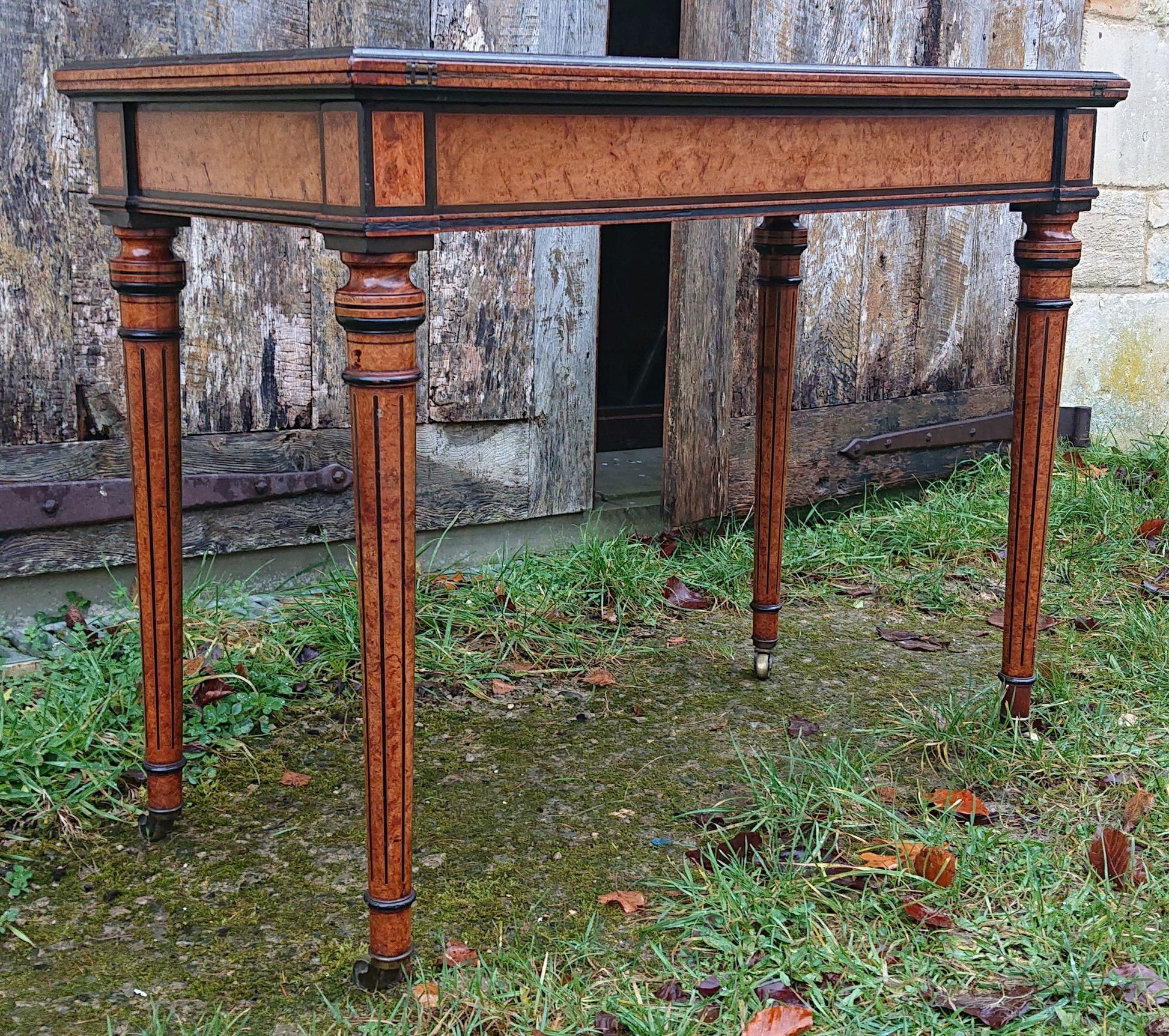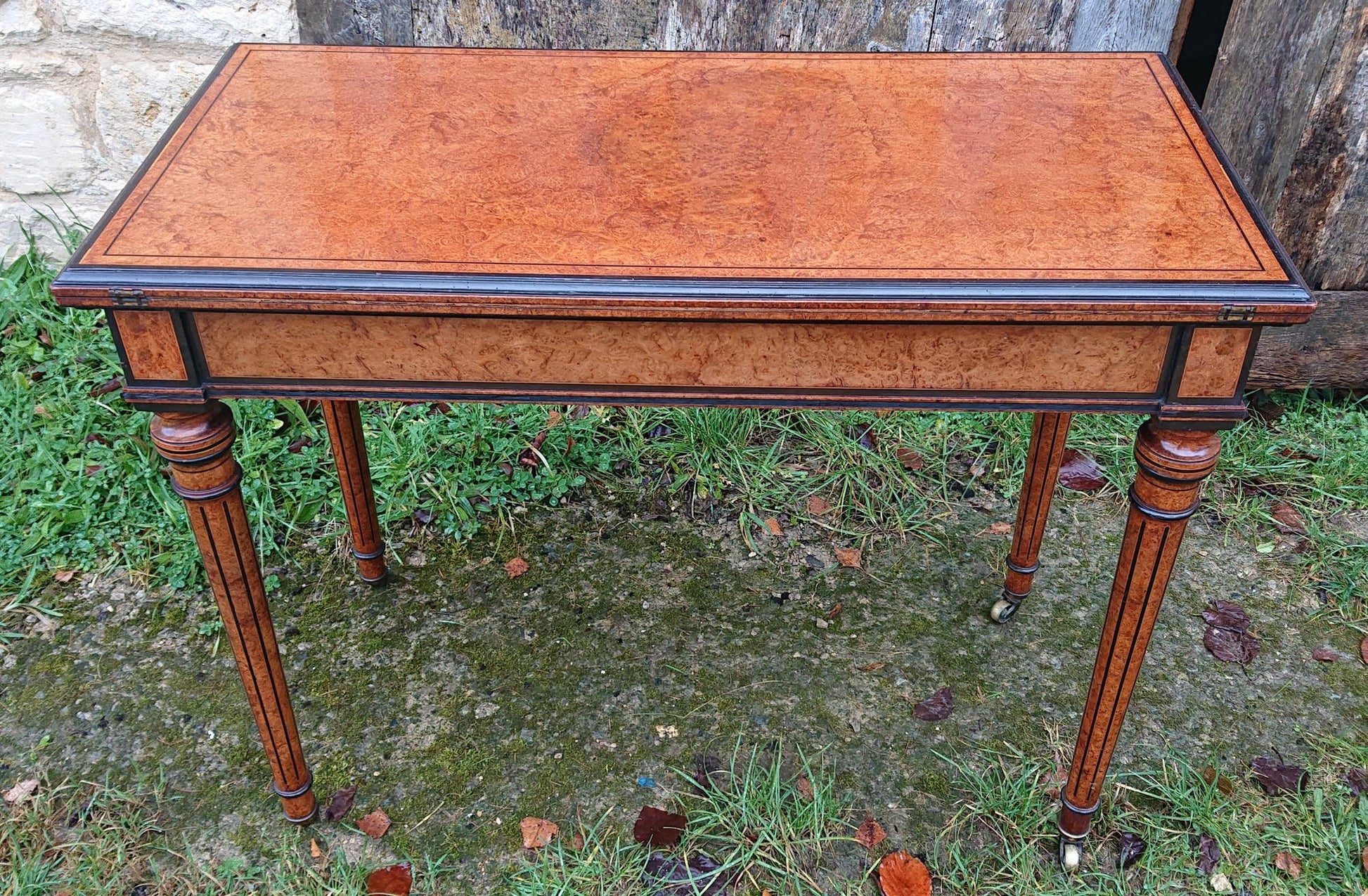Very fine exhibition quality card table made from amboyna with mahogany sliding mechanism and drawer lining. The fluting is actually ebony inlay and there is very fine stringing throughout. The hinges and their screws fit really precisely and all the screw heads line up (see photos).