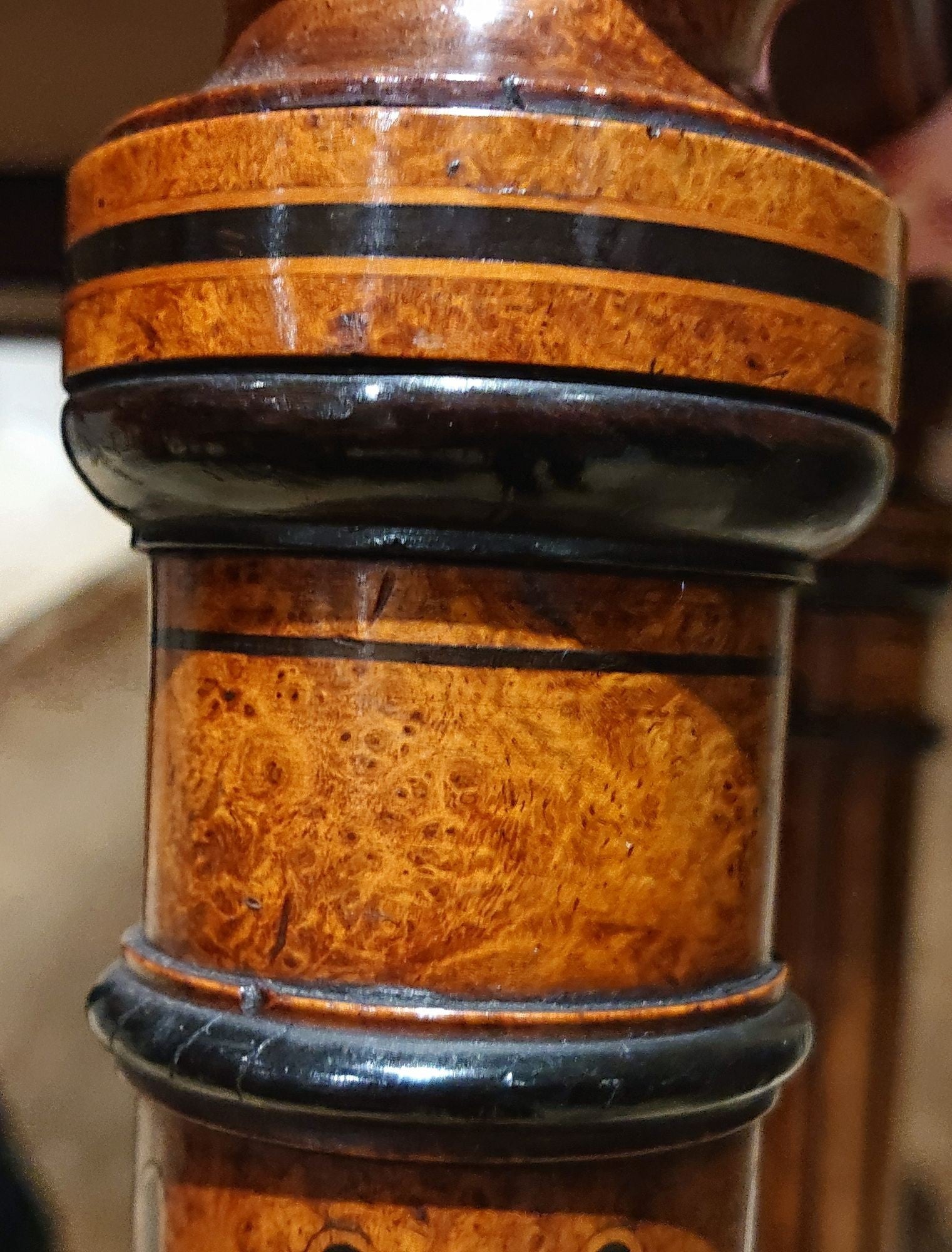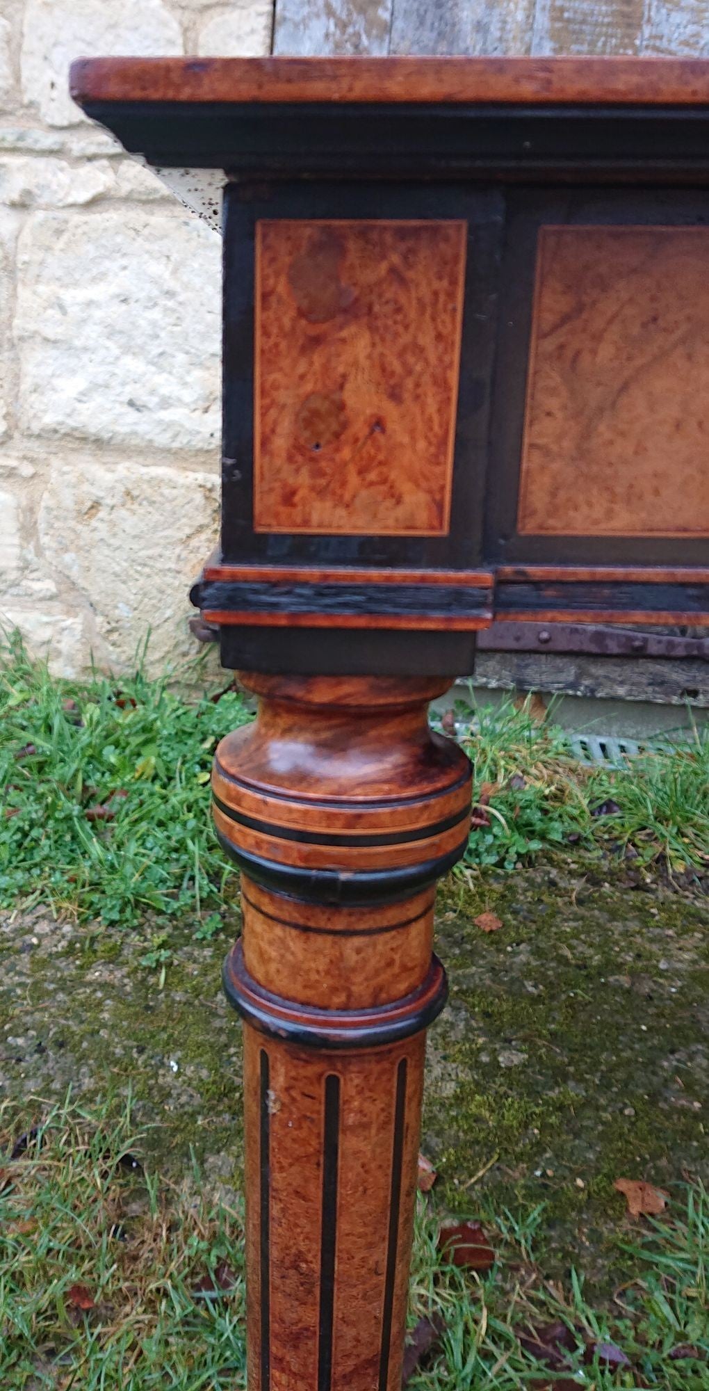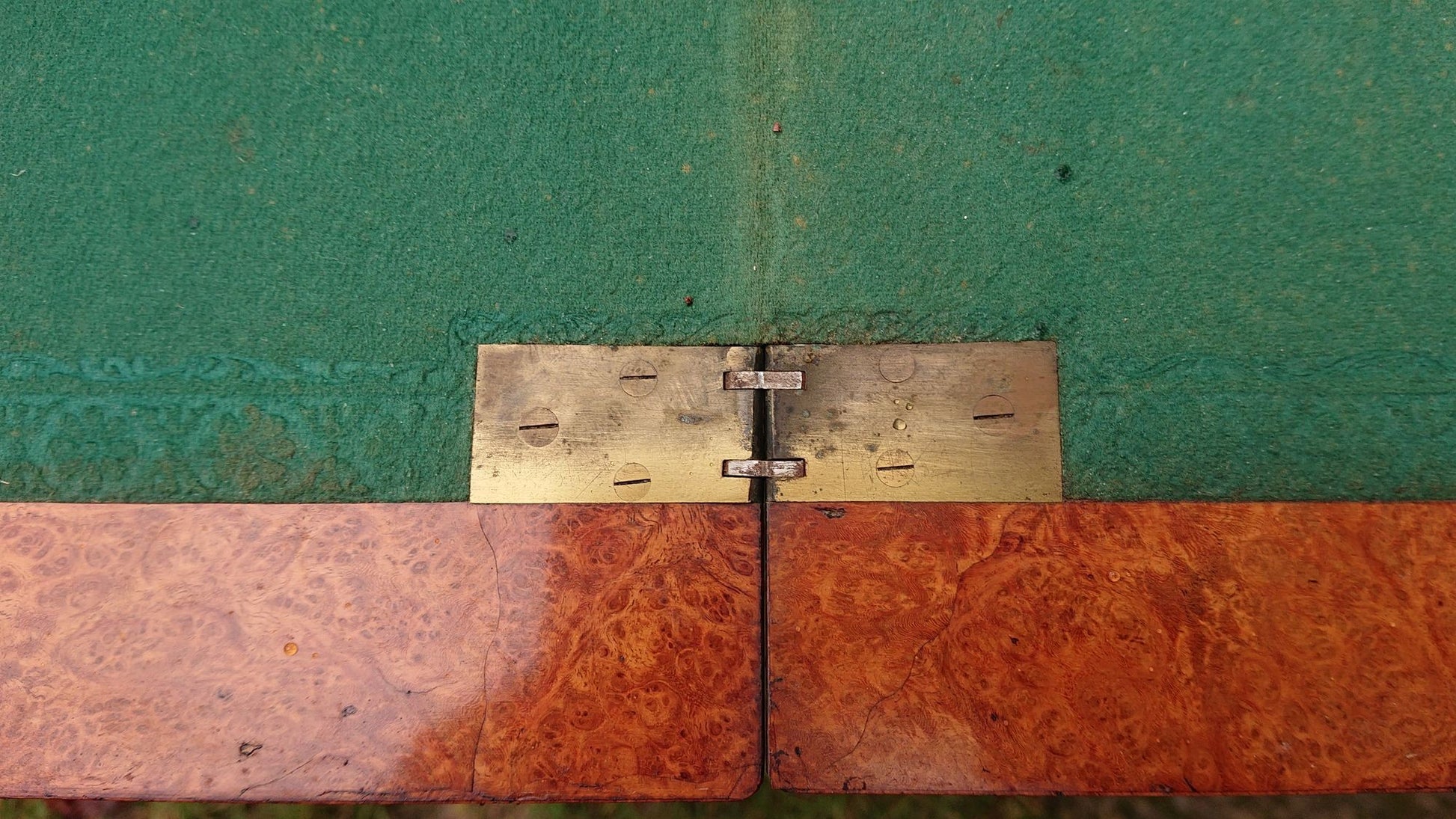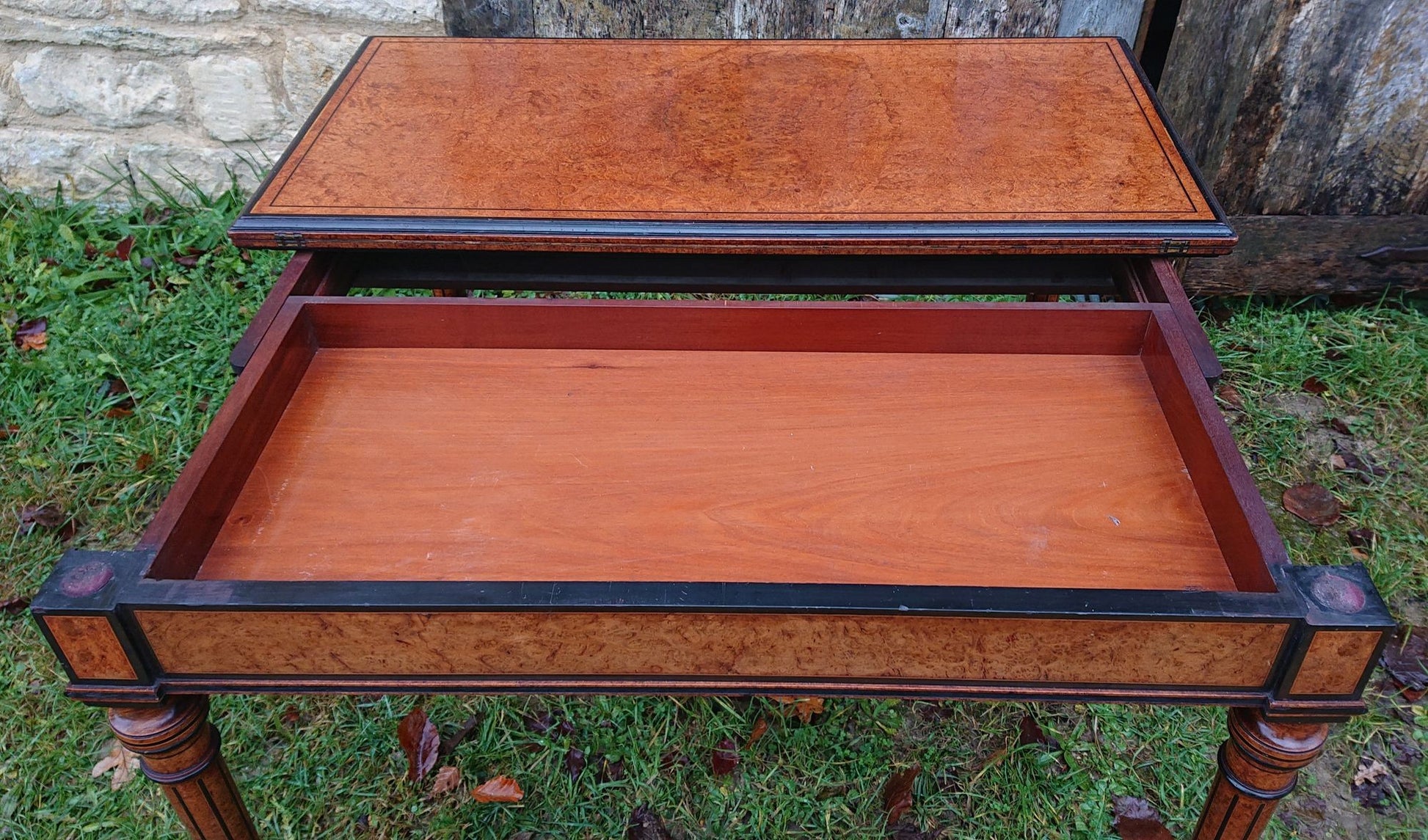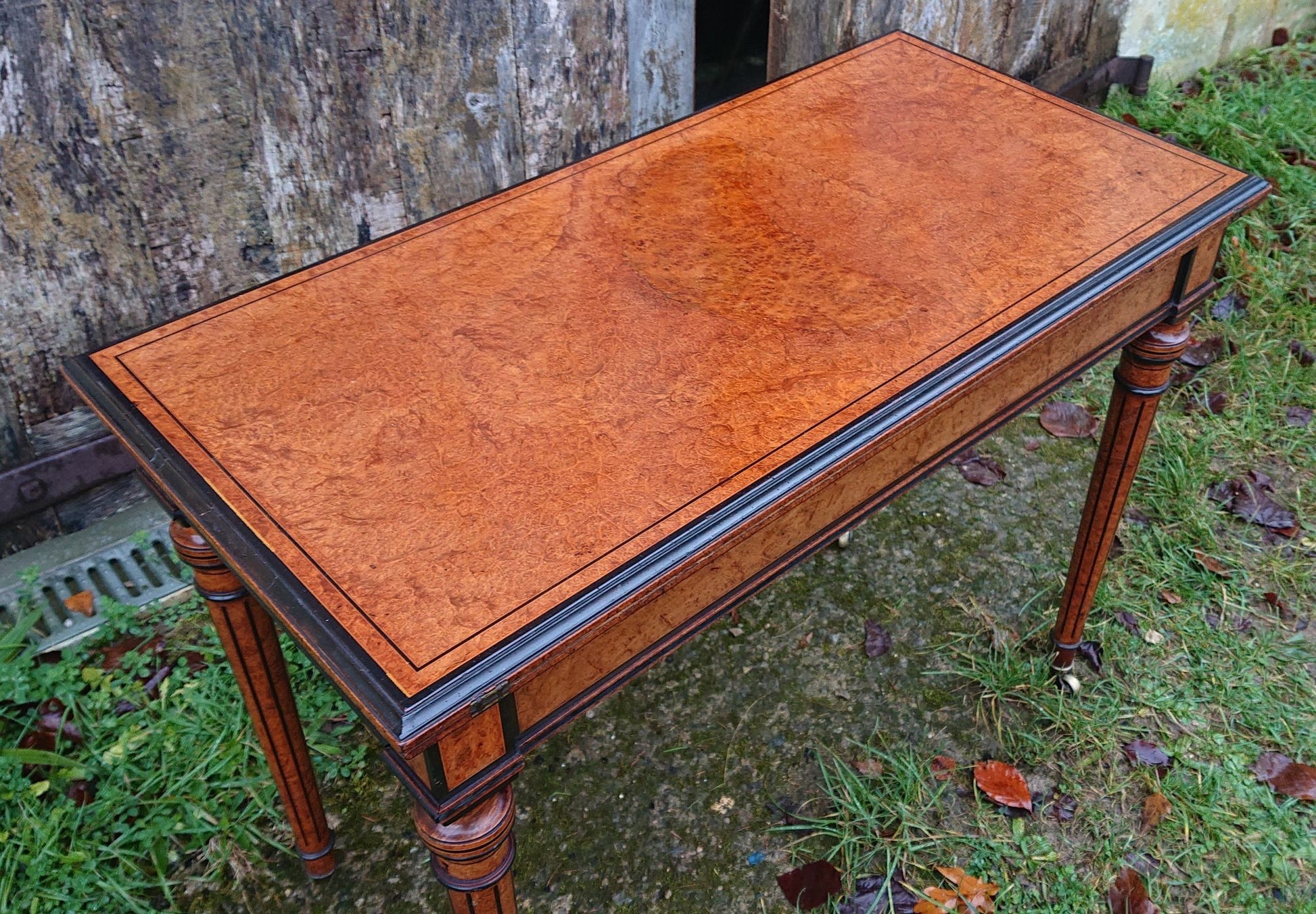 Very fine exhibition quality card table made from amboyna with mahogany sliding mechanism and drawer lining. The fluting is actually ebony inlay and there is very fine stringing throughout. The hinges and their screws fit really precisely and all the screw heads line up (see photos).