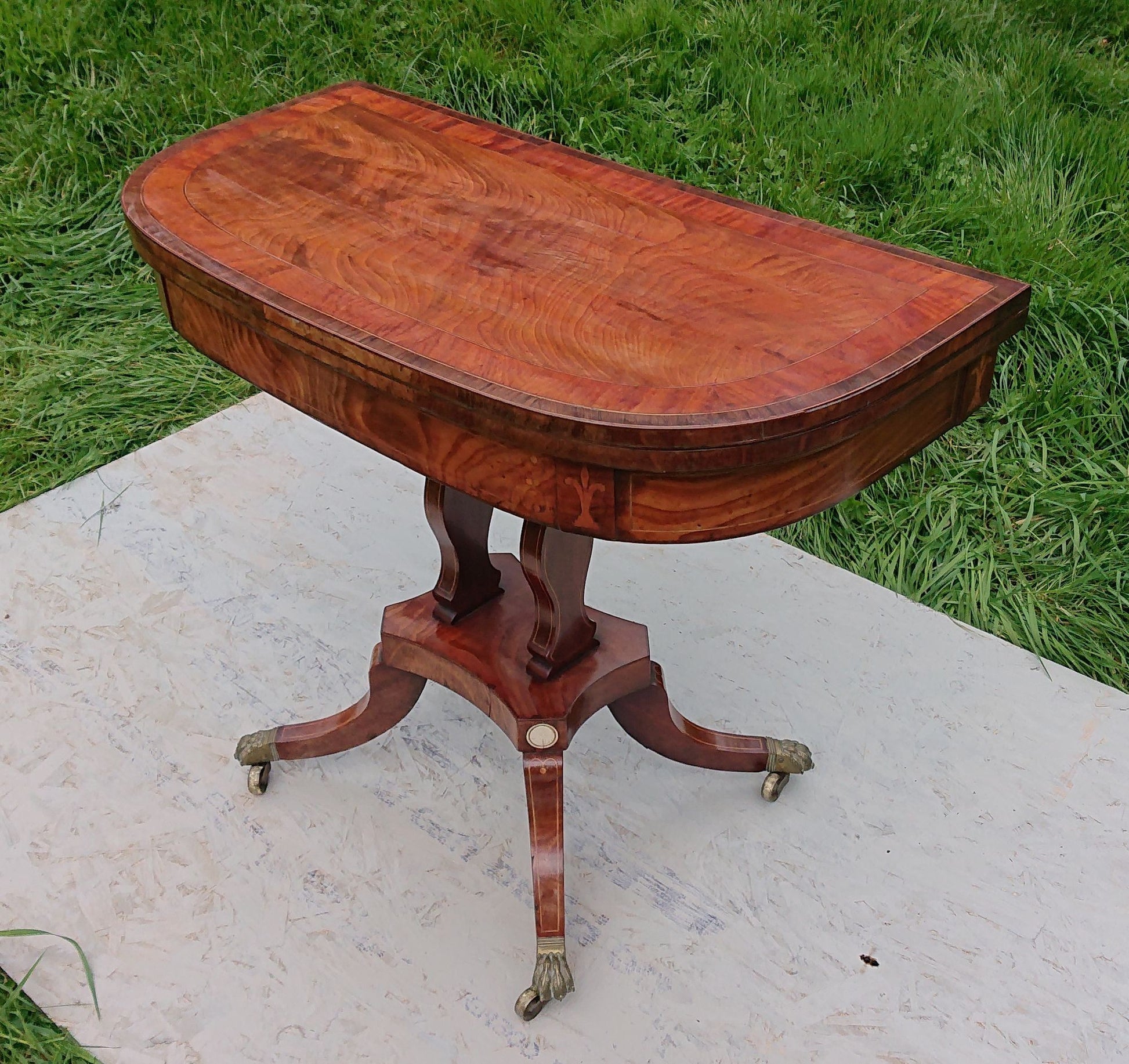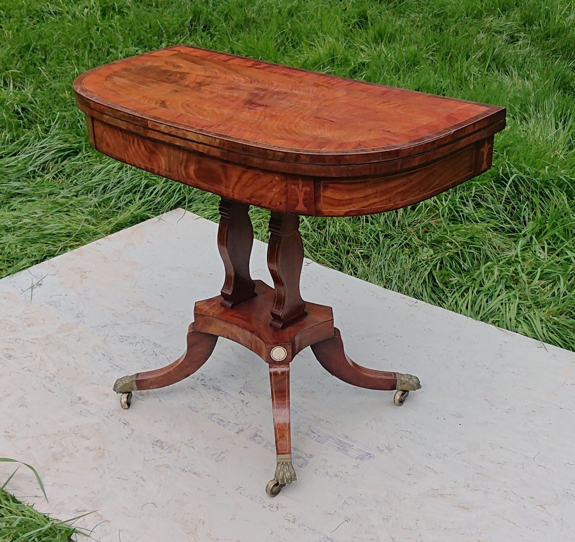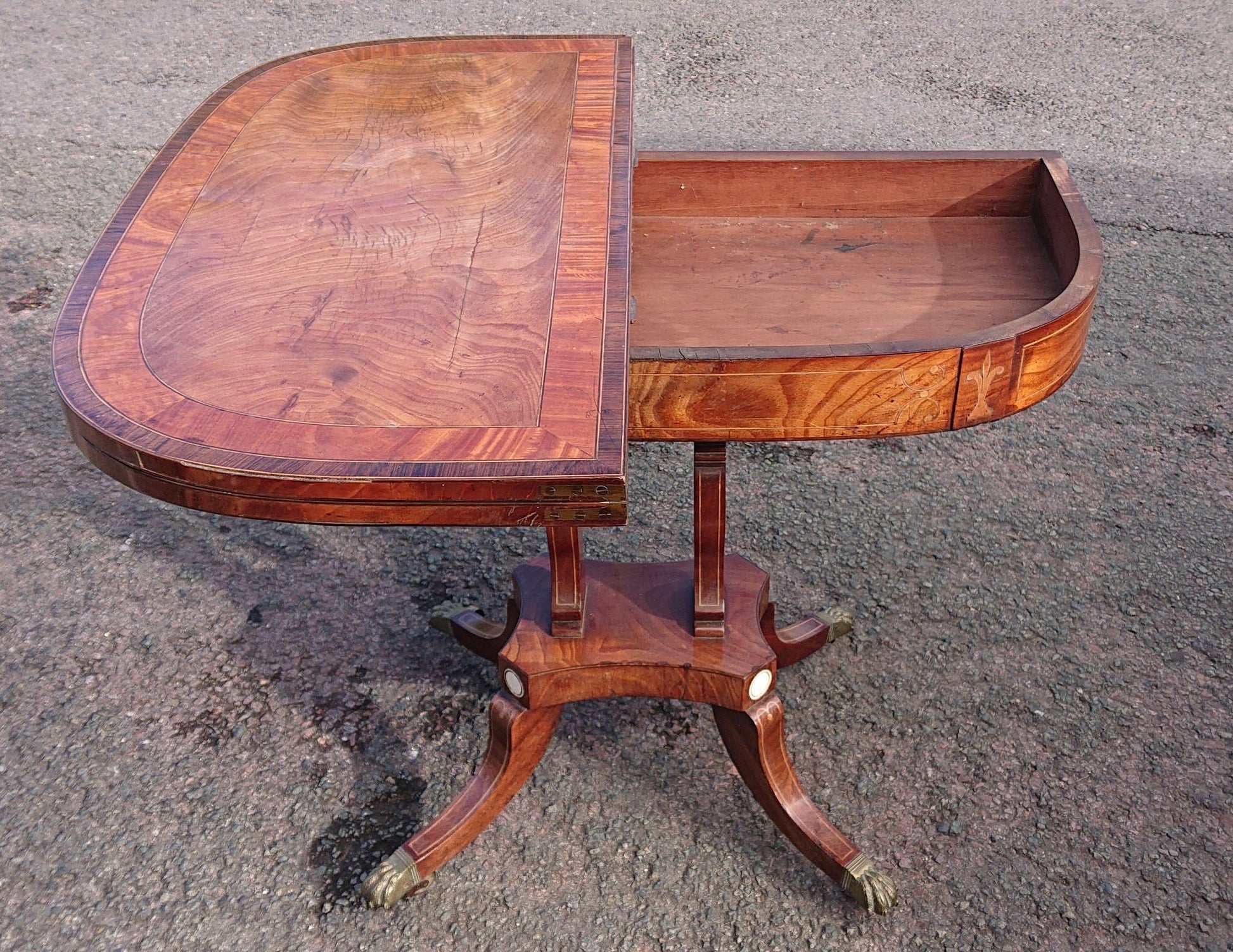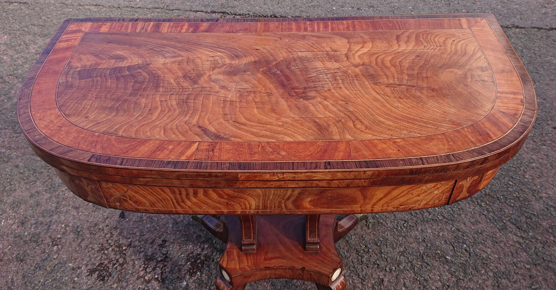 Very pretty card table, it is a really good colour, great grain pattern and with stringing and crossbanding and square bolt to keep it open. Regency c.1825