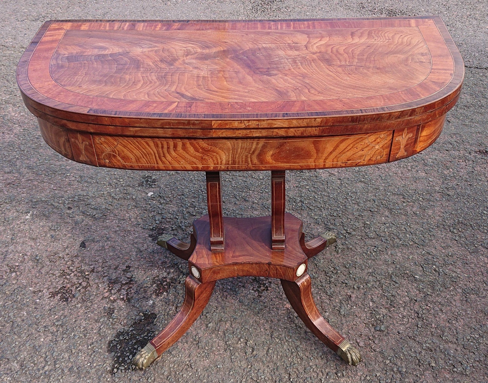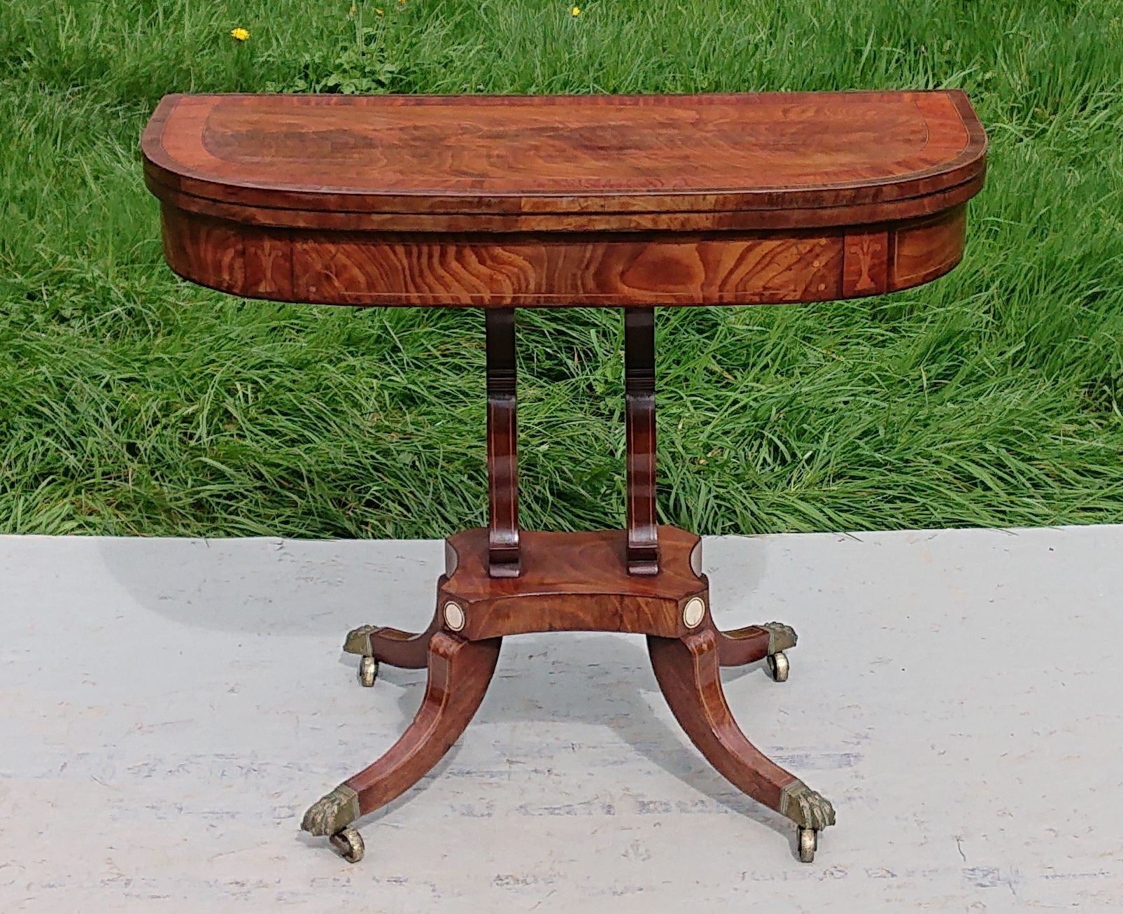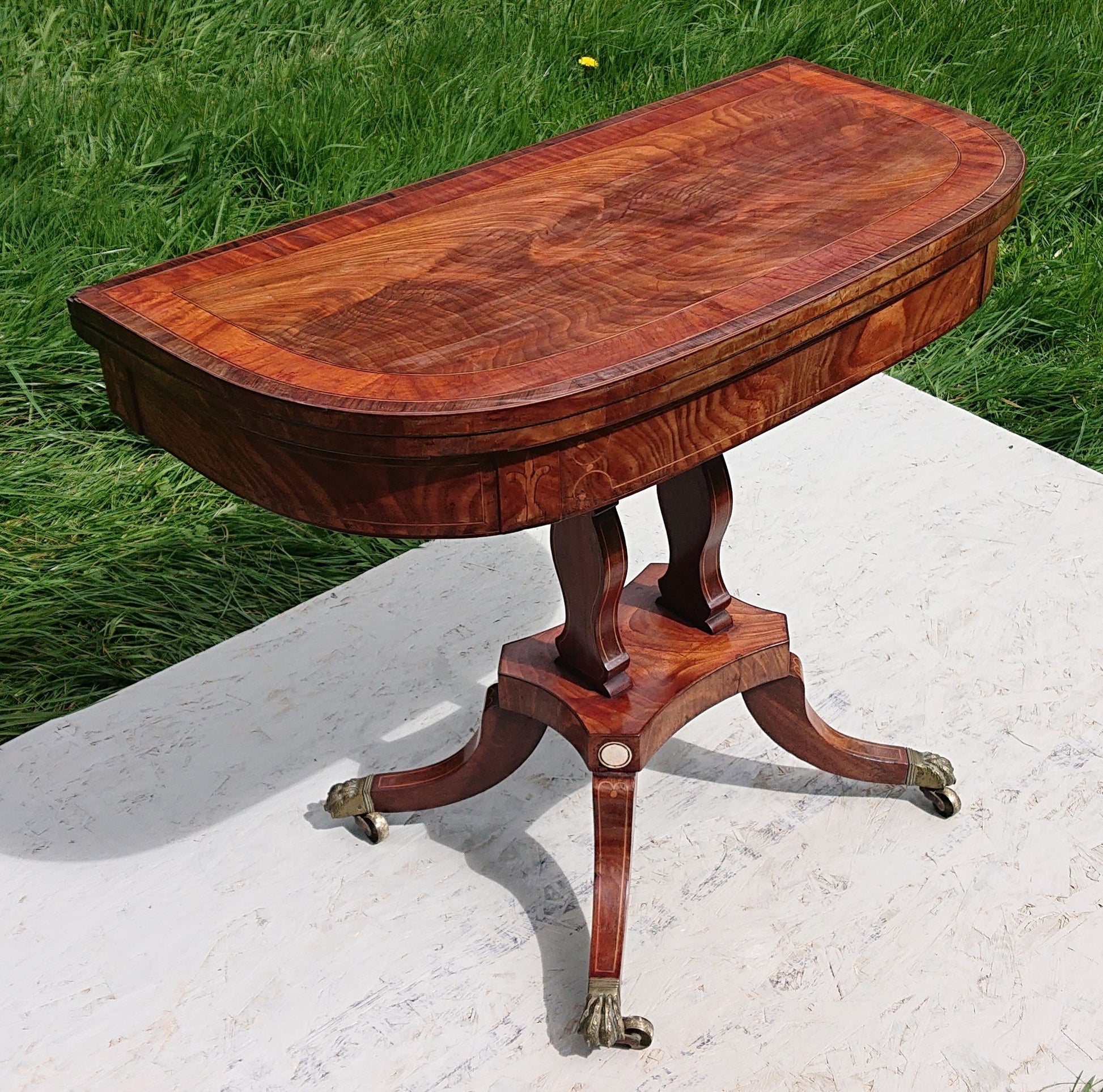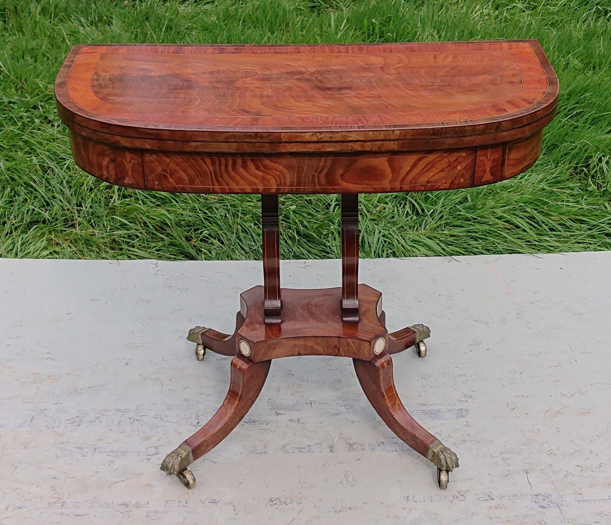 Very pretty card table, it is a really good colour, great grain pattern and with stringing and crossbanding and square bolt to keep it open. Regency c.1825