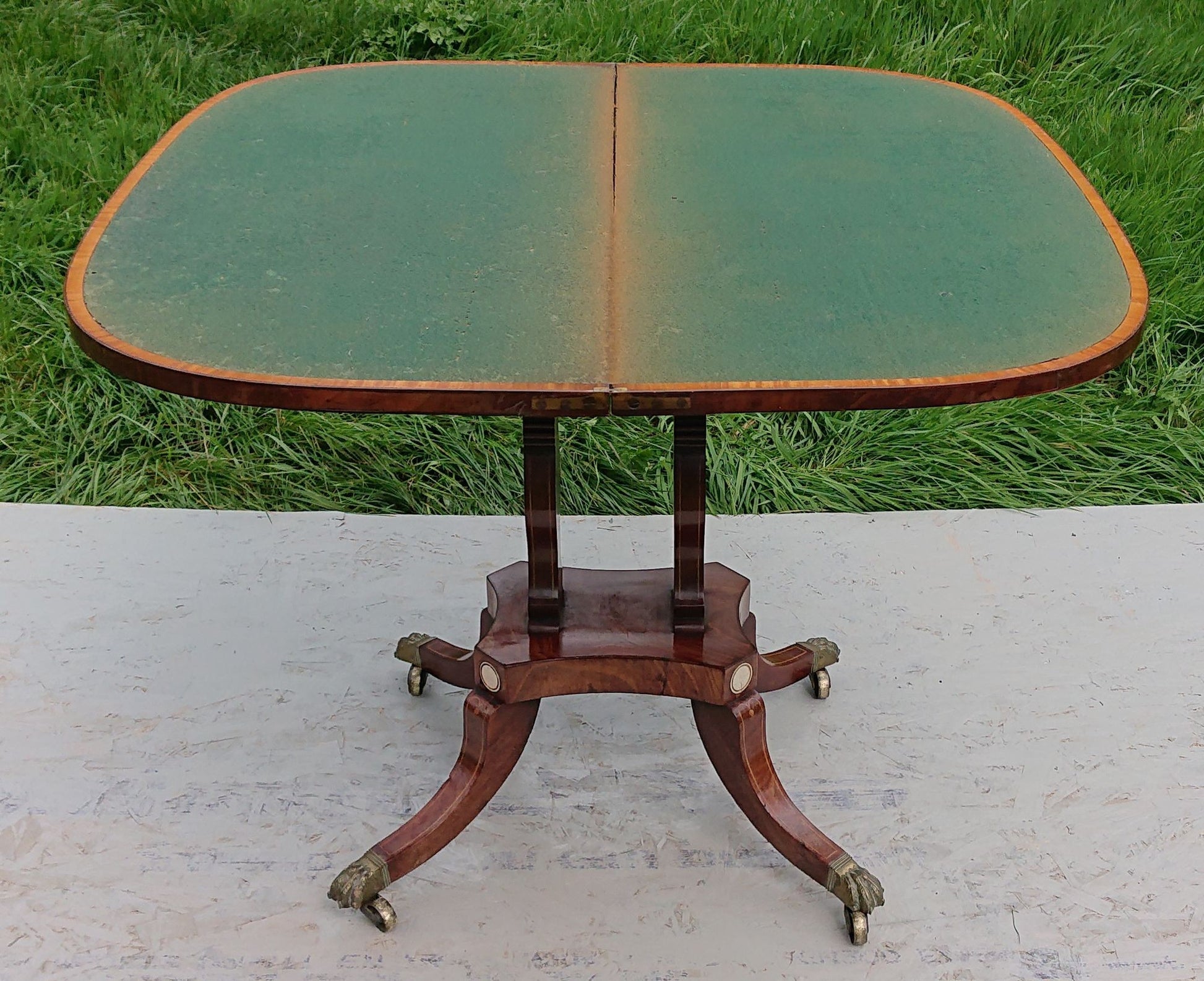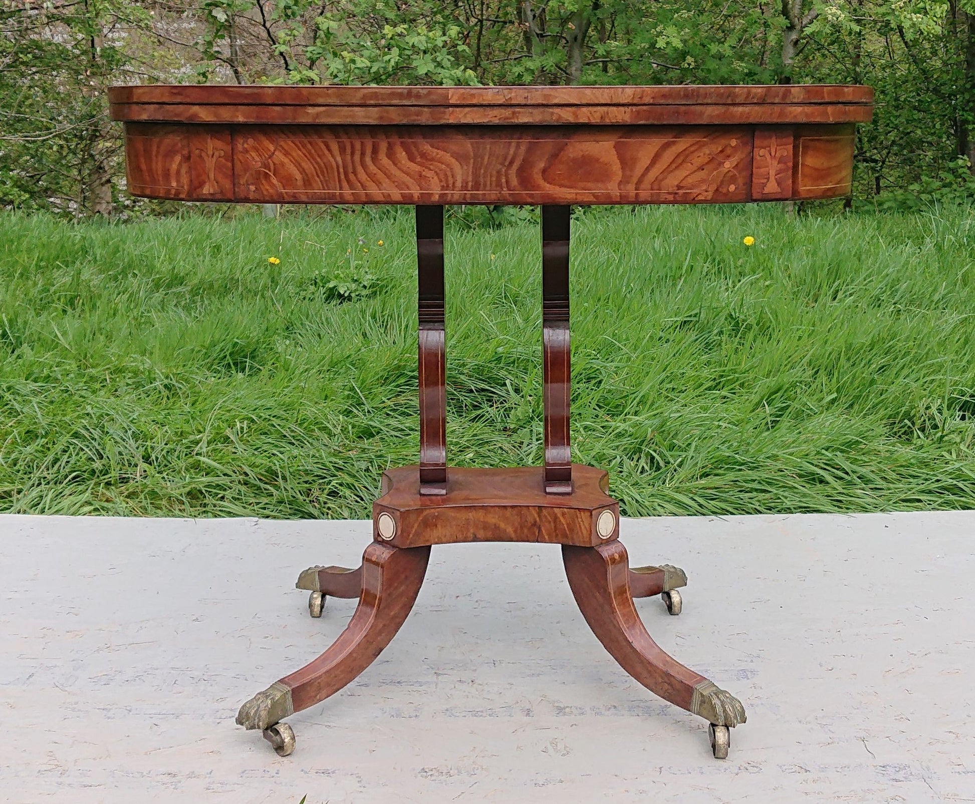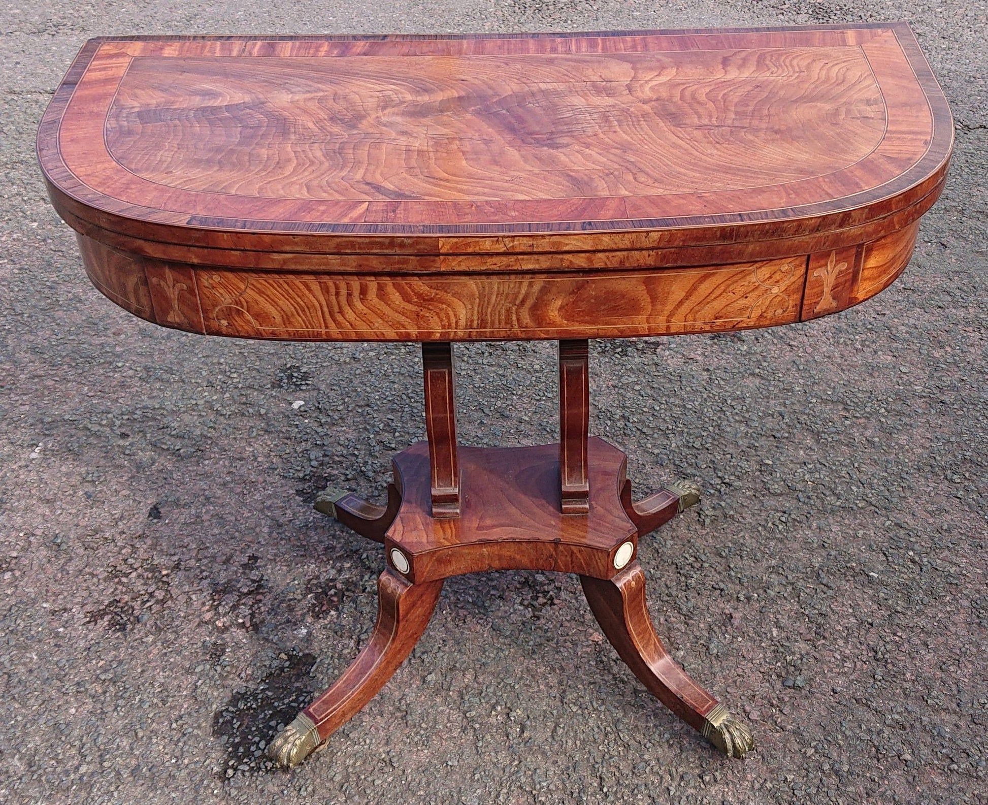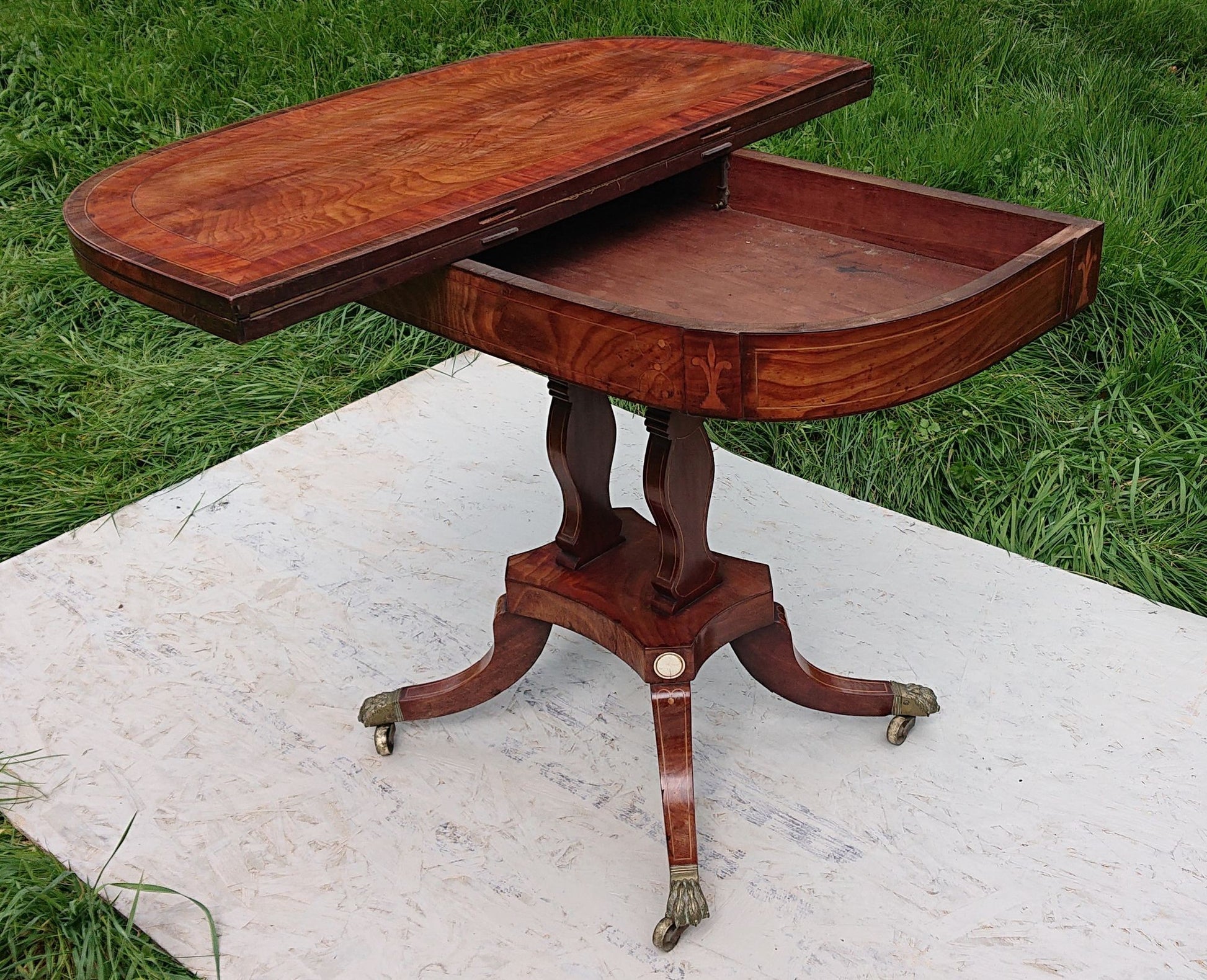 Very pretty card table, it is a really good colour, great grain pattern and with stringing and crossbanding and square bolt to keep it open. Regency c.1825