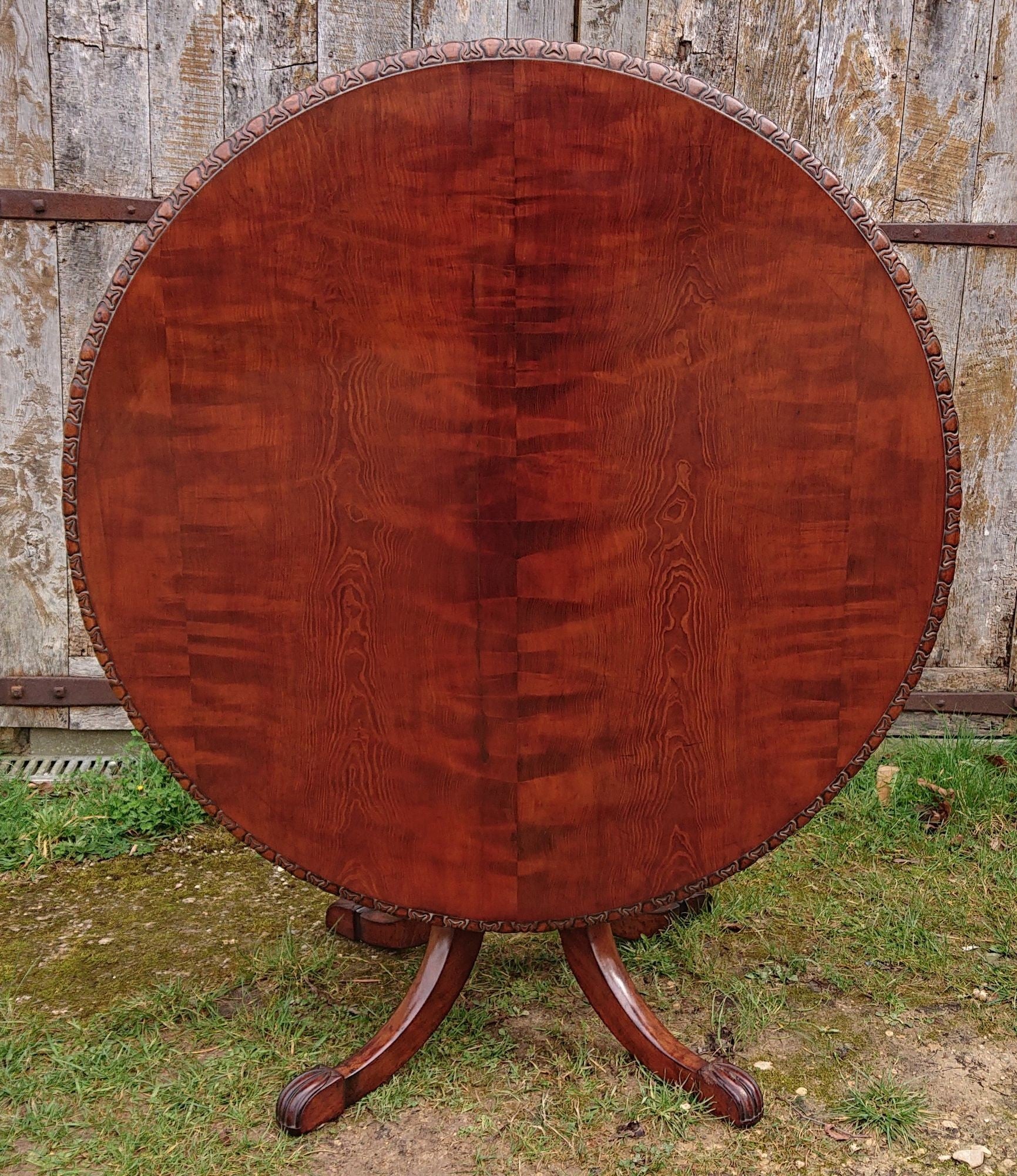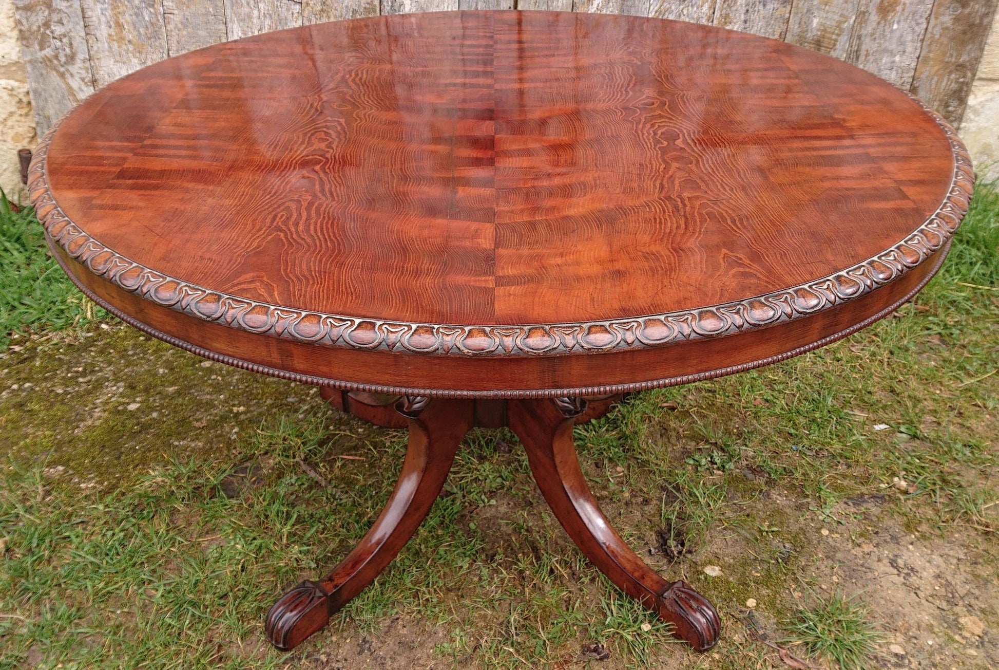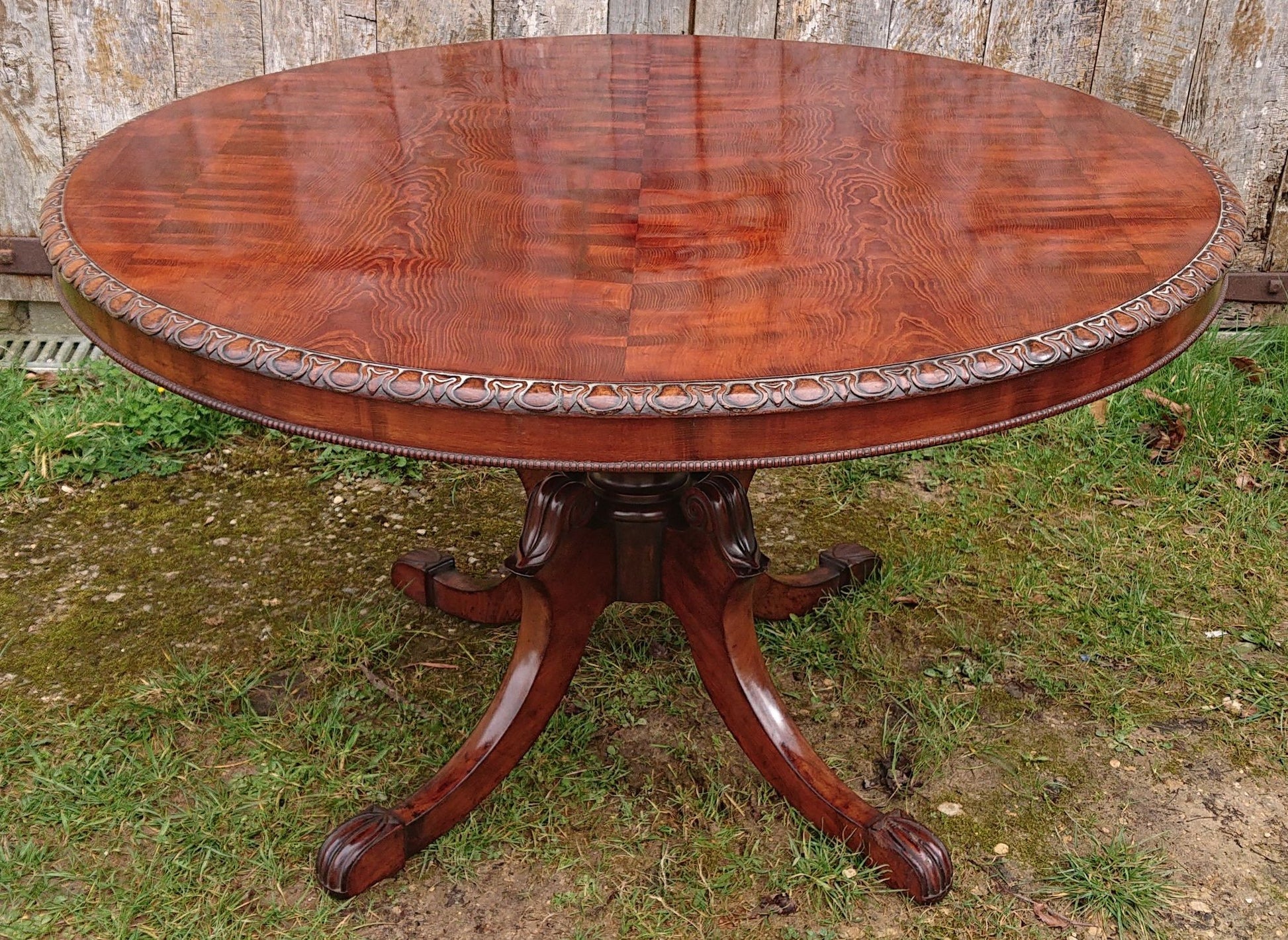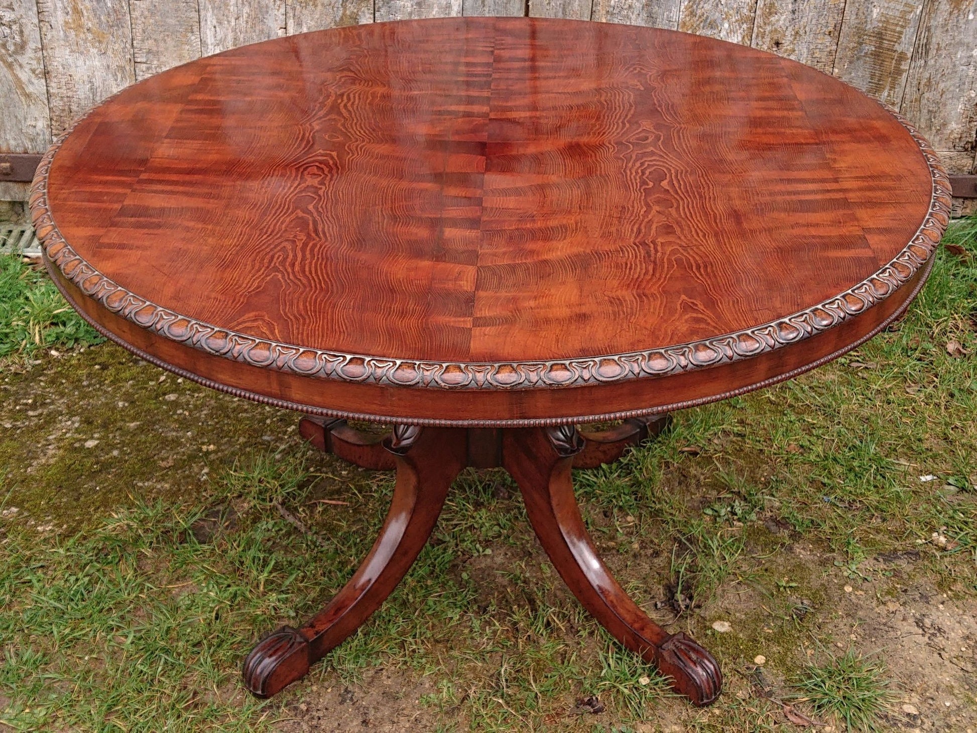 Exceptionally fine centre table with crisply carved four splay base and made of a very fine cut of exotic timber that has faded to a nicely patinated golden brown, this must have cost a lot to commission when new and it follows that it would therefore have been made for an important house. We especially like the way that the legs begin parallel to the pedestal and terminate parallel to the floor.