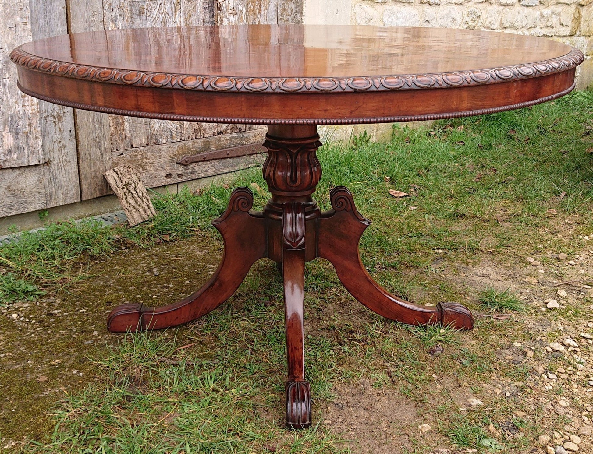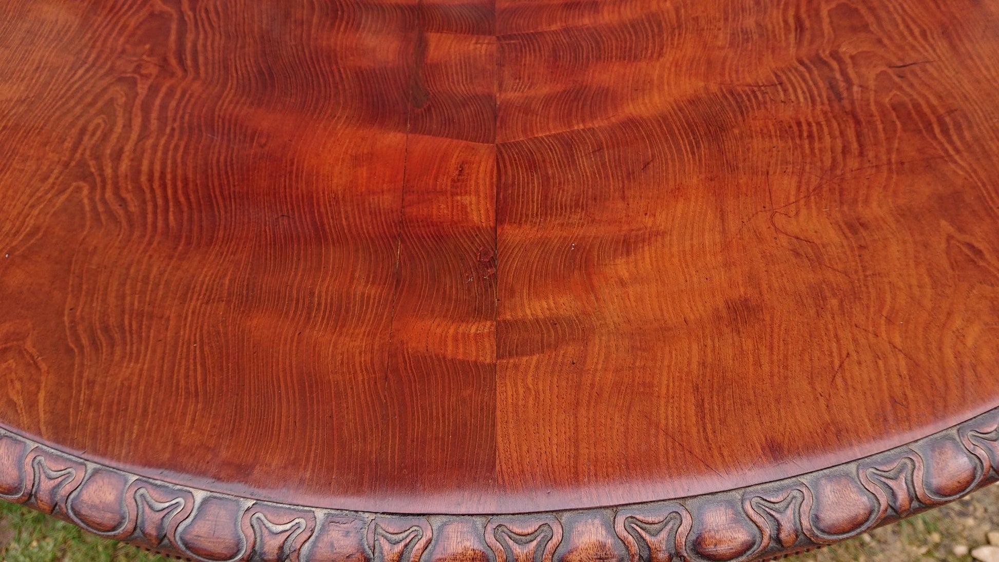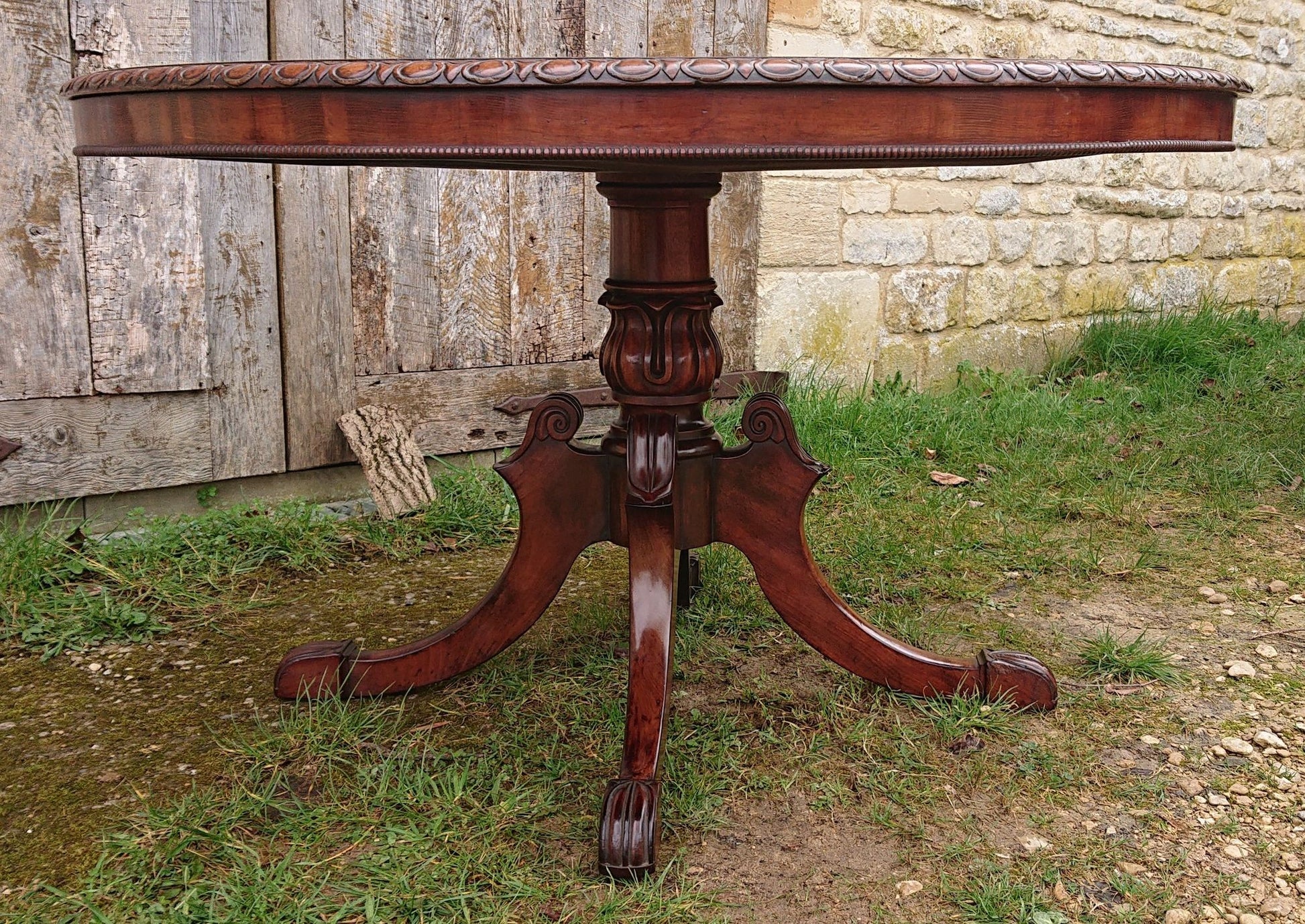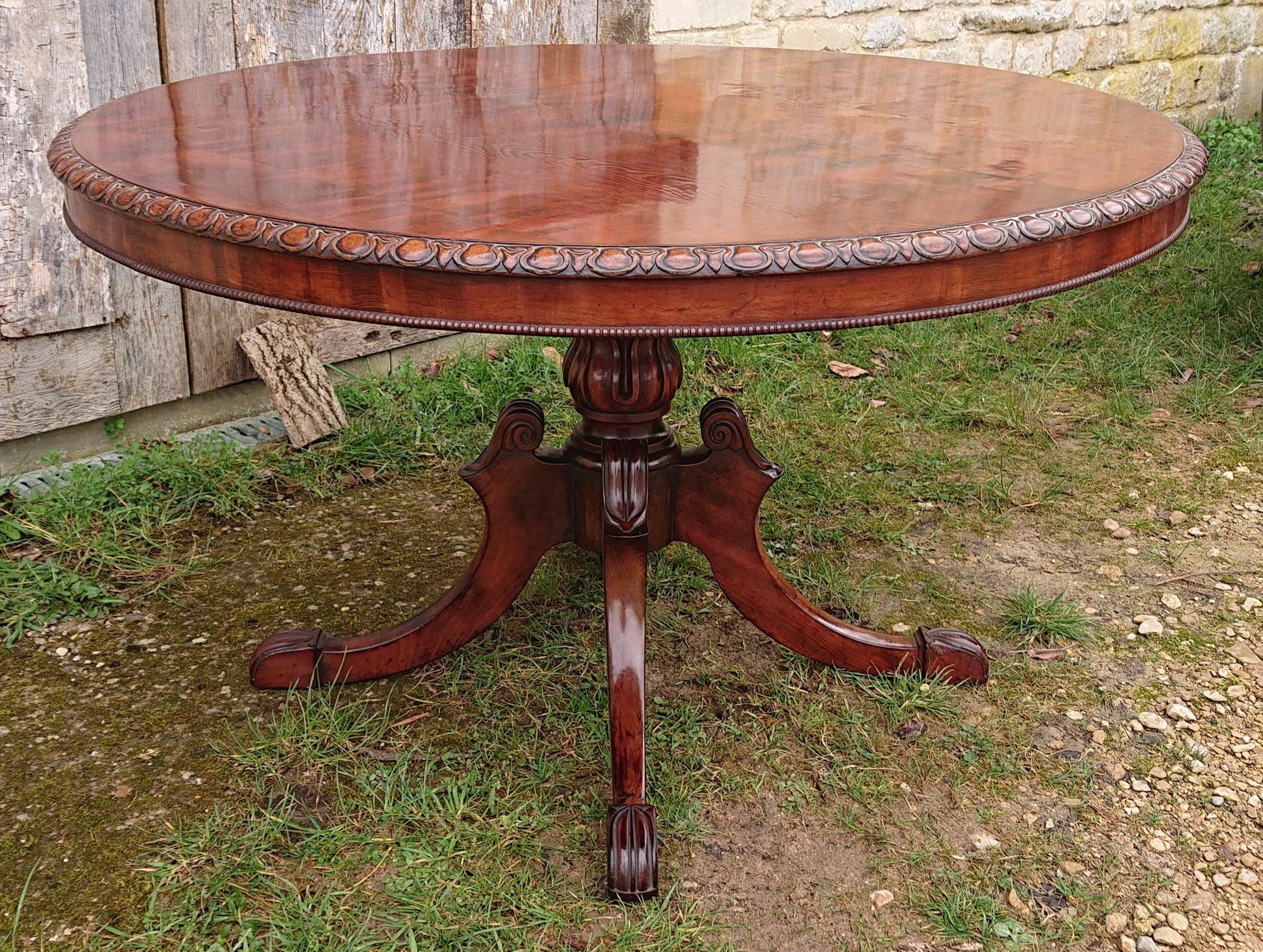Exceptionally fine centre table with crisply carved four splay base and made of a very fine cut of exotic timber that has faded to a nicely patinated golden brown, this must have cost a lot to commission when new and it follows that it would therefore have been made for an important house. We especially like the way that the legs begin parallel to the pedestal and terminate parallel to the floor.